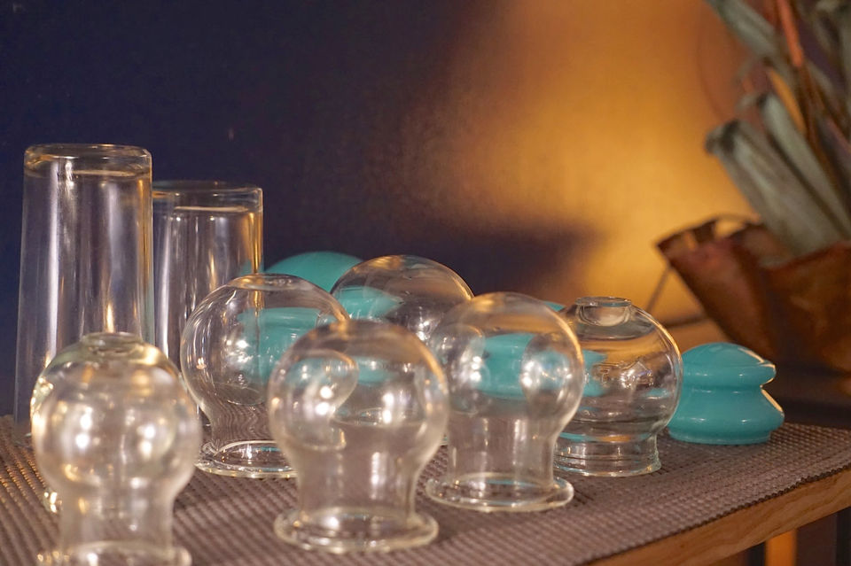 Five minutes of cupping is equal to 30 minutes of deep tissue massage. Cupping Therapy uses vertical or round glasses (similar to a regular drinking glass) to create suction and gently pull (rather than push as in a regular massage) on the muscles for a more complete release of fascia, nerves and adhesions.
